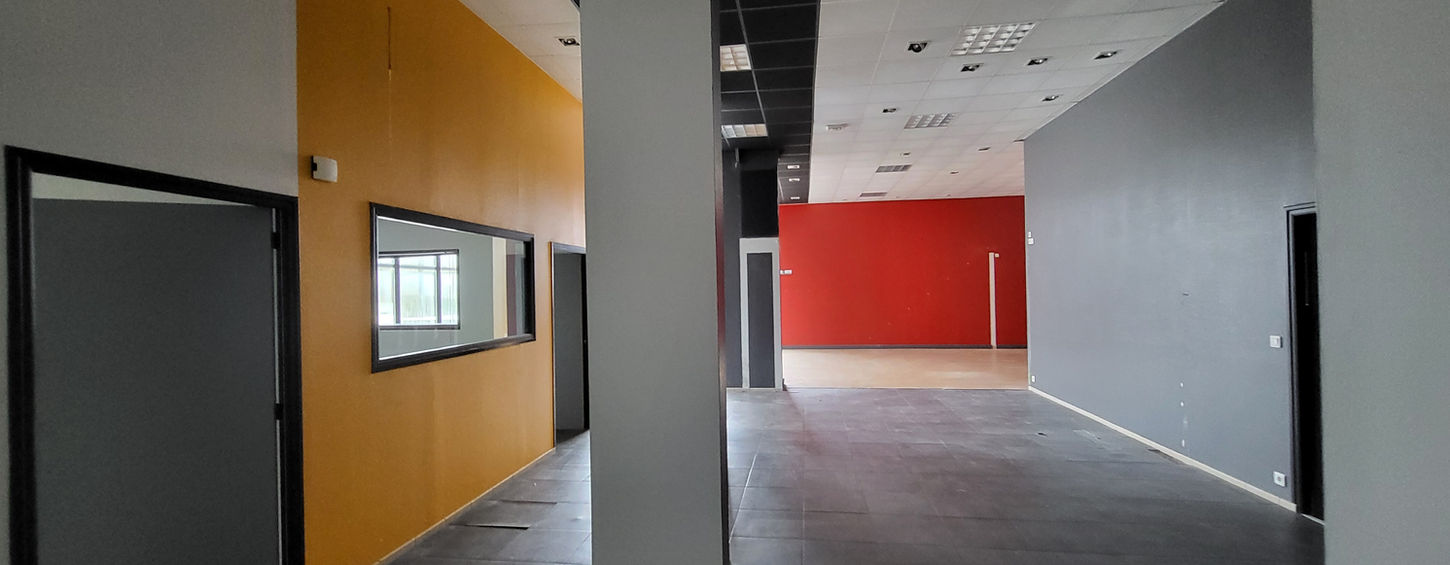 En première ligne offrant une visibilité 4voies, Local de 340m² compenant un beau showroom vitré, des bureaux, une zone stockage, terrain clos pour parking & stockage extérieur.
